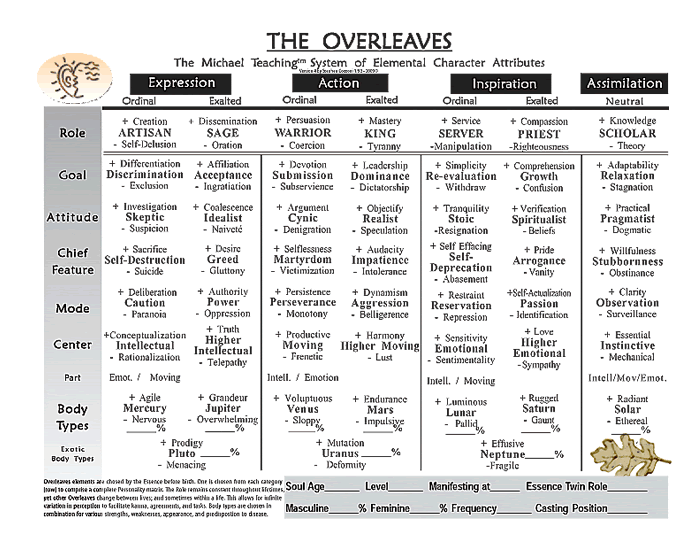 To begin, the Michael Teaching is a metaphysical view of creation and the human experience. The Universal Force driving this creation is referred as the TAO, rather than God, in an effort to remove the gender stereotyping of a masculine deity. The Overleaf Energies are the “flavors” or “primary colors” of the TAO. It follows then, that when an unique Essence or Soul decides to experience individuality (separation from God) that the building blocks available to it are the same basic materials of the Universe itself. (i.e. the Overleaves). As a personality trait system, the Overleaves have been channeled and are validated intuitively and empirically by Michael Students, rather than statistically like other personality trait systems. Each Overleaf trait has distinct, identifiable physical appearance and energy signature that one can be trained to discern and recognize. Michael Channel’s have been born with this talent though refinement of the skill occurs with practice.