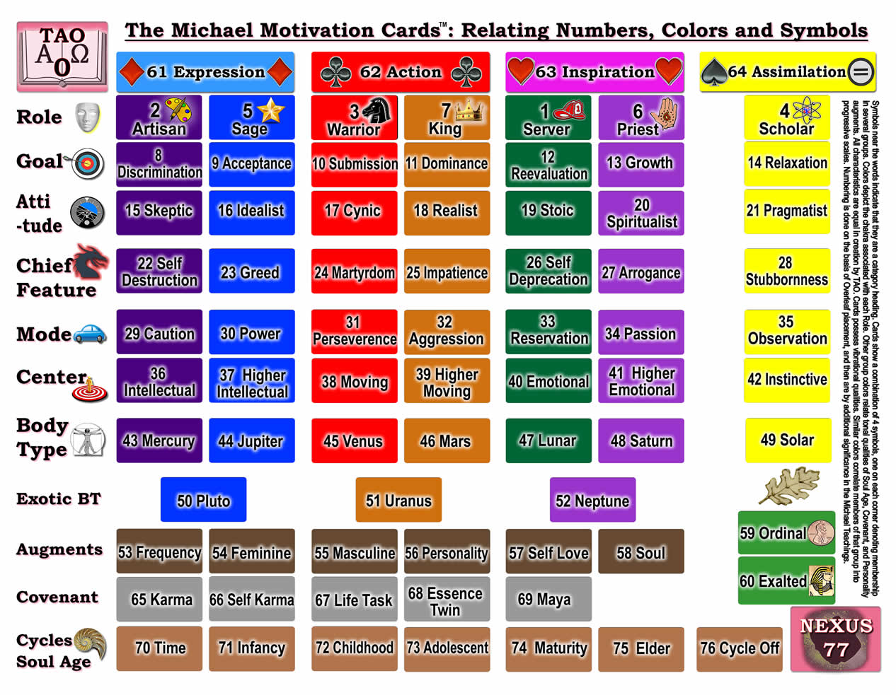 Symbols near the words indicate that they are a category heading. Cards show a combination of 4 symbols, one on each corner, denoting a membership in several groups. Colors depict the chakra associated with each Role. Other group colors relate tonal qualities of Soul Age, Covenant, and Personality augments. All characteristics are equal in creation by TAO. Cards possess vibrational qualities. Similar colors correlate members of that group into progressive scales. Numbering is done on the basis of Overleaf placement, and then are by additional significance in the Michael Teachings.
